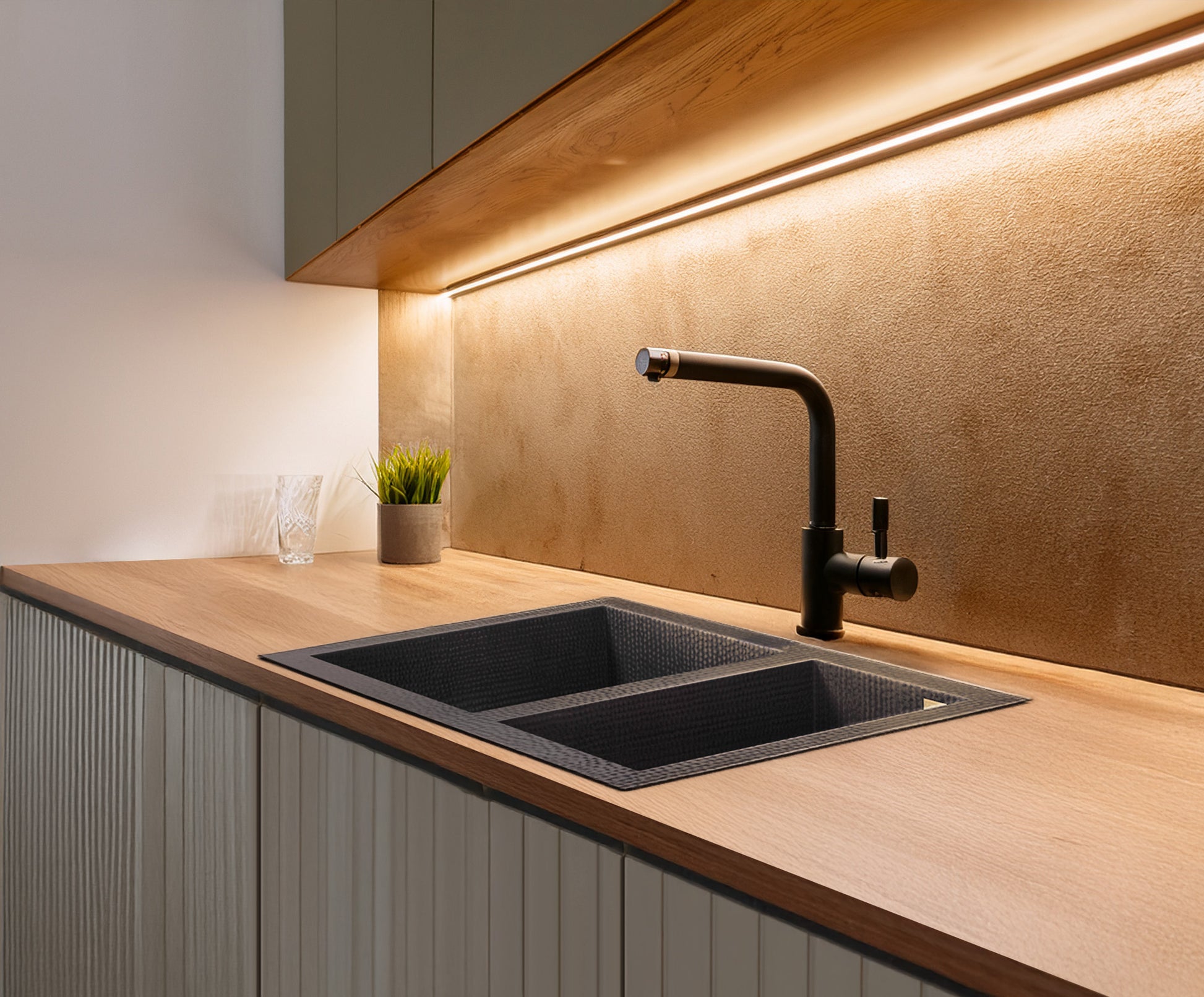 Kitchen sinks combine the exquisite craftsmanship of Mexican artisans with a simple, hammered design to create an elegant and functional copper sink.